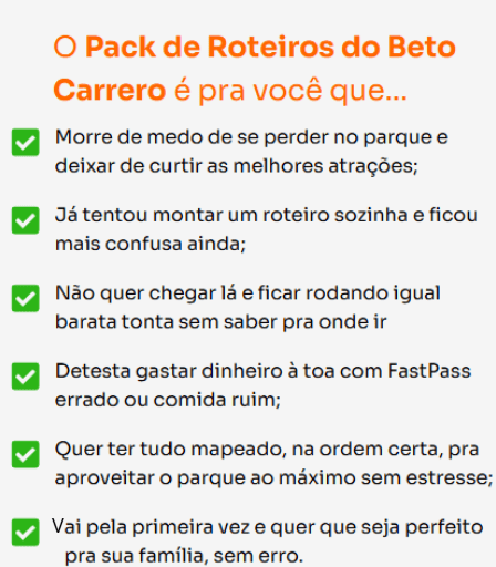Você recebe 10 roteiros prontos, testados e aprovados, com a ordem ideal das atrações, horários e sugestões práticas.